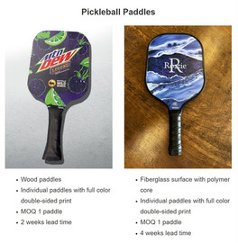Good news - We've got you covered, and you're the first to know about it. We are fans! Pickleball is one of the hottest sports right now, which is why we partnered with a production facility for match-quality custom -branded paddles, sets & more...